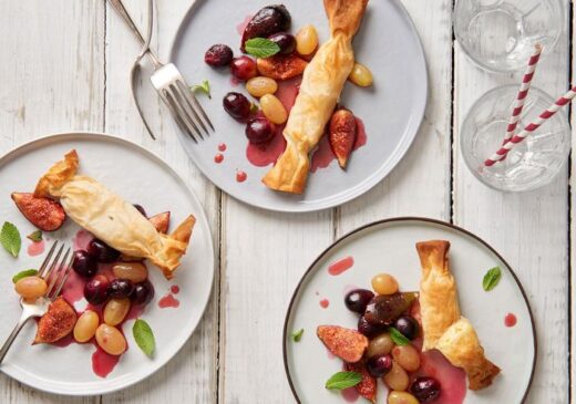 Die Trauben in ein wenig Butter andünsten. Den Johannisbeergelee, den Honig und den Zitronensaft beigeben, ca. 1 Minute köcheln bevor die in Schnitze geschnittenen Feigen hinzugegeben werden. Alles ca. 1 Minute ziehen lassen. Bonbons mit dem Feigen-Traubensalat anrichten. Nach Belieben mit Minze garnieren.