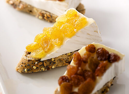 Die Oberfläche des Camemberts mit den Sultaninen bedecken.