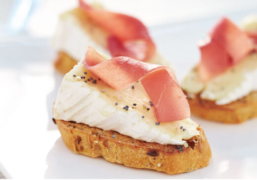 Schinkenscheiben in dünne Streifen schneiden und vorsichtig auf die Camembert-Stücke legen.