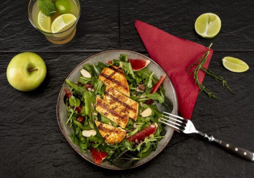 Salat mit Blutorange, Kernen, Nüssen und Salatdressing vermischen. Fromella Käsesteak danach auf dem Salat anrichten.
