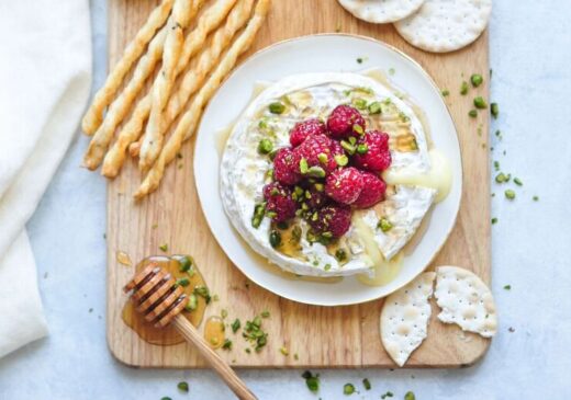Den Camembert mit den Himbeeren garnieren und ein wenig Honig darüber träufeln. Mit den gehackten Pistazien bestreuen und sofort servieren.