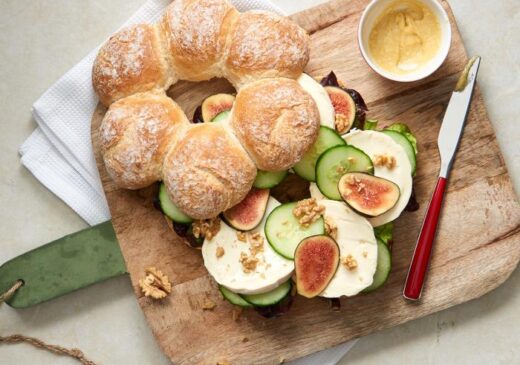 Für das gefüllte Brot die Gurke, die Feigen und den Käse in Scheiben schneiden und die Nüsse grob hacken. Das Brot der Länge nach ganz aufschneiden und beidseitig mit der Honig-Senf-Butter bestreichen. Daraufhin alle vorbereiteten Zutaten und die Salatblätter in das Brot füllen, den Deckel aufsetzen und als Ganzes servieren.