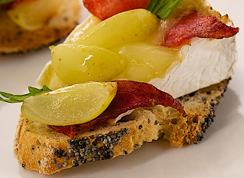 Das Vollkornbrot in Scheiben schneiden, jeweils ein Stückchen Hohle Gasse und die geviertelten Trauben darauf platzieren.