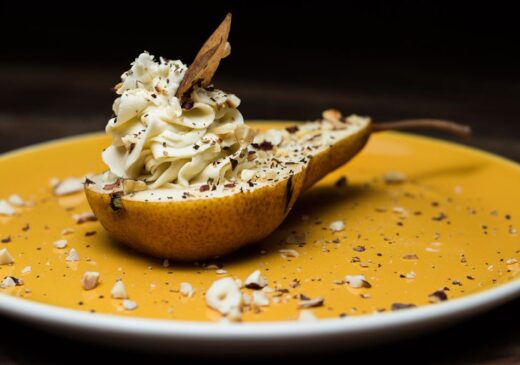 Birnen halbieren, auf der runden Seite ein Bödeli abschneiden, dass die Birne gut steht. Kerngehäuse mit dem Pariserlöffel entfernen und den Limburgerrahm rosettenförmig auf die Birne spritzen. Mit dem abgeschnittenen Birnenbödeli und gehackten und gerösteten Haselnüssen dekorieren.