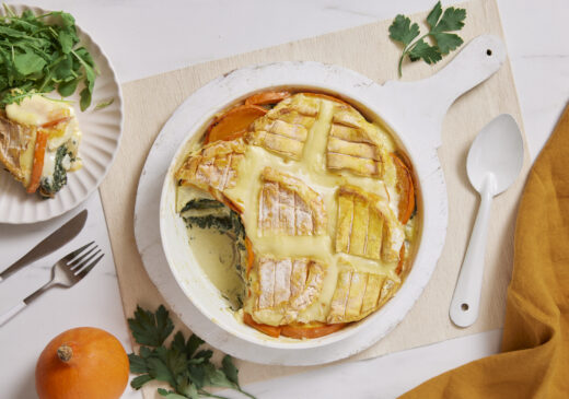Schichtung: zuerst eine Schicht Kartoffeln, dann Spinat mit Sahne, Zwiebeln, dünne Schicht Kartoffeln, gebackene Kürbisscheiben.