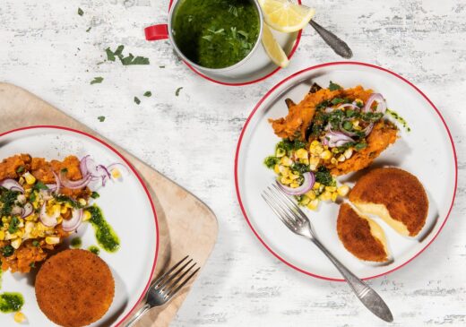 Panada in einer beschichteten Bratpfanne mit wenig Öl bei mittlerer Hitze beidseitig je ca. 3 Minuten braten. Gemüse aus dem Ofen nehmen. Maiskörner vom Kolben schneiden. Süsskartoffeln mit einer Gabel zerdrücken, auf Teller verteilen. Zwiebel in feine Schnitzchen schneiden. Mais und Zwiebelschnitzchen darauf verteilen. Panada neben dem Süsskartoffelstampf anrichten. Kräuteröl darüberträufeln.