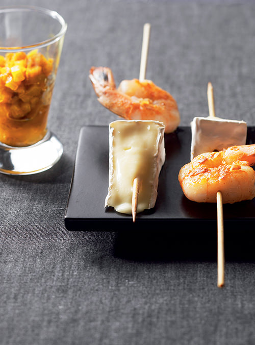 Brochettes de crevettes et Camembert Suisse Crémeux au confit de mangue