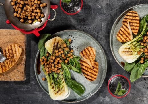 Répartir le pak choï sur les assiettes. Puis répartir les pois chiches sur le chou. Couper les steaks Fromella en deux et dresser à côté du chou et des pois chiches. Saupoudrer de graines de sésame.