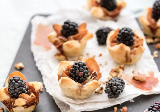 Estrarre la pasta sfoglia dal frigorifero poco prima della preparazione e tagliare anchessa in quadrati di 4 × 4 cm. Disporre un pezzo di pasta e uno di prosciutto in ciascuna formina.